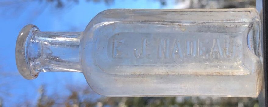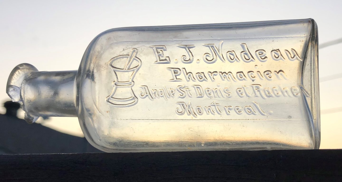 Embossage : E.J. Nadeau / Pharmacien / Angle St Denis et Rachel / Montréal.