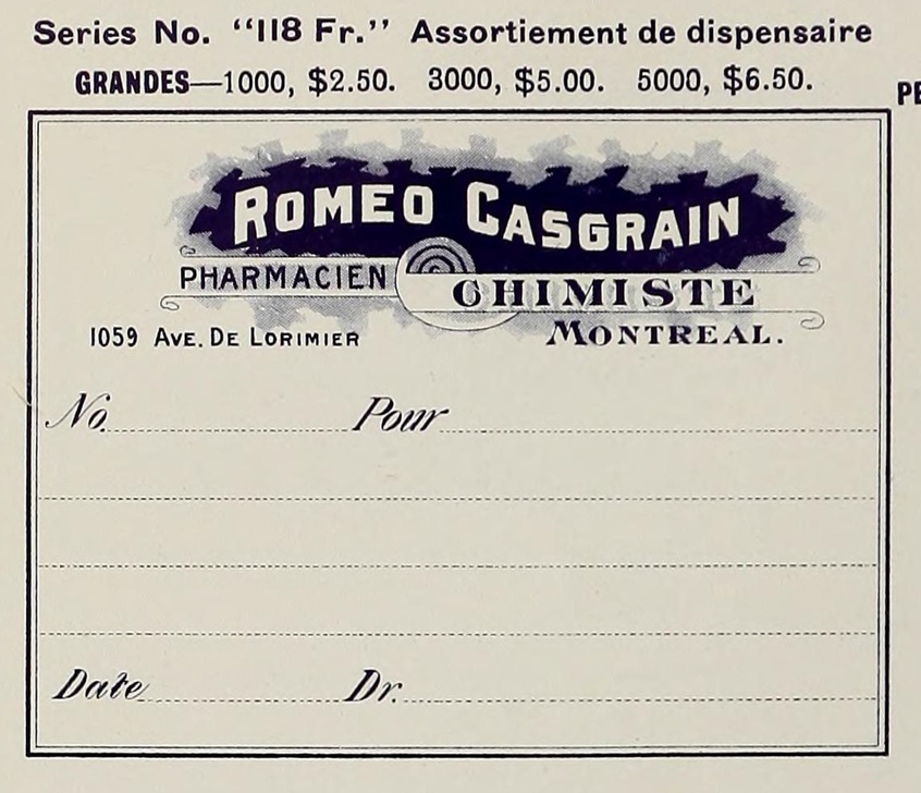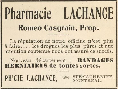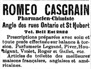 Roméo Casgrain, natif de Montréal, a fait ses études au collège de Montréal et à l'école de pharmacie. Il ouvrit une pharmacie à l'angle des rues Ontario et St-Hubert, puis il se porta acquéreur de la célèbre pharmacie de Séraphin Lachance en 1904, sur la rue Ste-Catherine. Plus tard, il fonda l'établissement bien connu Casgrain & Charbonneau. Il ouvrit apparemment selon certaines sources une autre pharmacie Roméo Casgrain en 1921. Il décéda en 1926 à l'âge de 48 ans. Son épouse prit alors la pharmacie en main, puis son fils Marc en assura la relève. Ce dernier devint propriétaire de la pharmacie H.G. Pépin en 1945.
