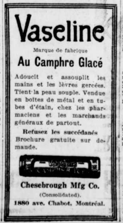 Bien qu'il s'agisse d'une compagnie d'origine américaine (New-York, et plus tard New-Jersey), la Chesebrough Mfg. Co. eut une agence de distribution à Montréal à partir de 1879, si on se fie aux annuaires Lovell, et y resta au moins jusque dans les années 1950.