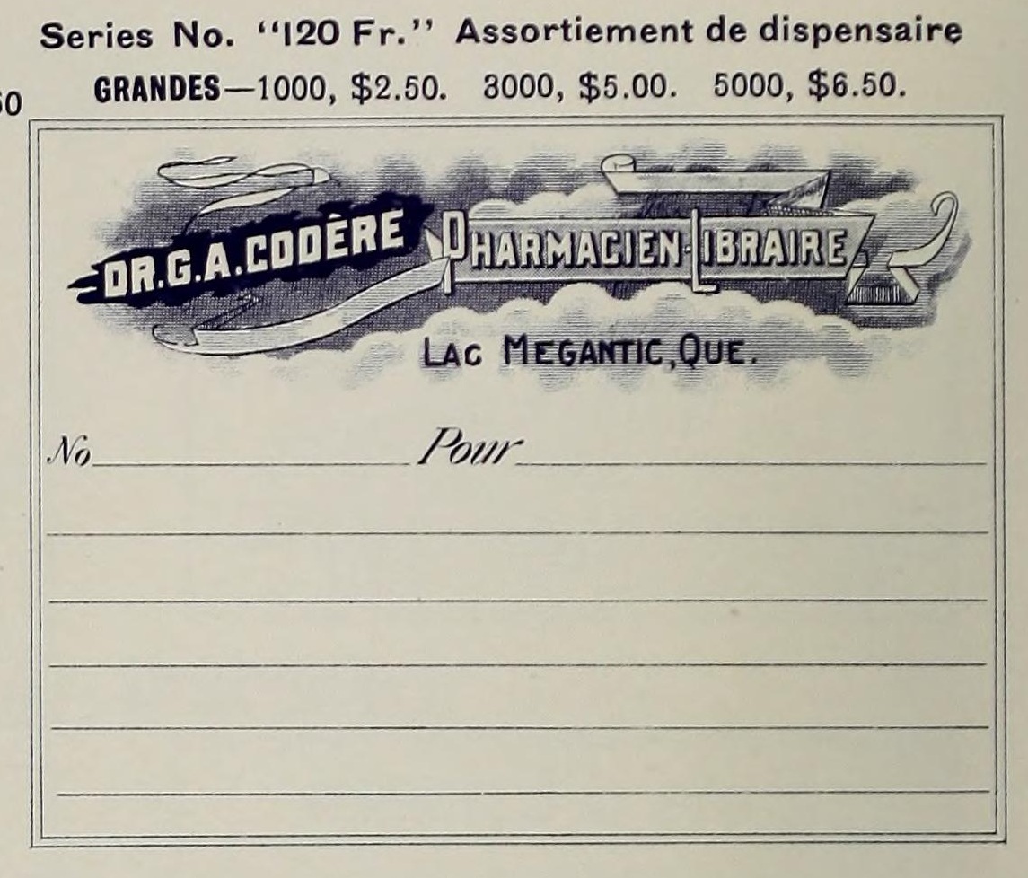 Le docteur Codère a ouvert sa pharmacie au coin de la rue Principale et d'une rue conduisant au lac en octobre 1893, où il demeurait au deuxième étage. Il en eut possession une vingtaine d'années avant de vendre à un certain Dr. Léo Blais en 1914. Il retourna pratiquer à Sherbrooke, sa ville natale, au 49 rue Alexandre, coin de la rue Ball.