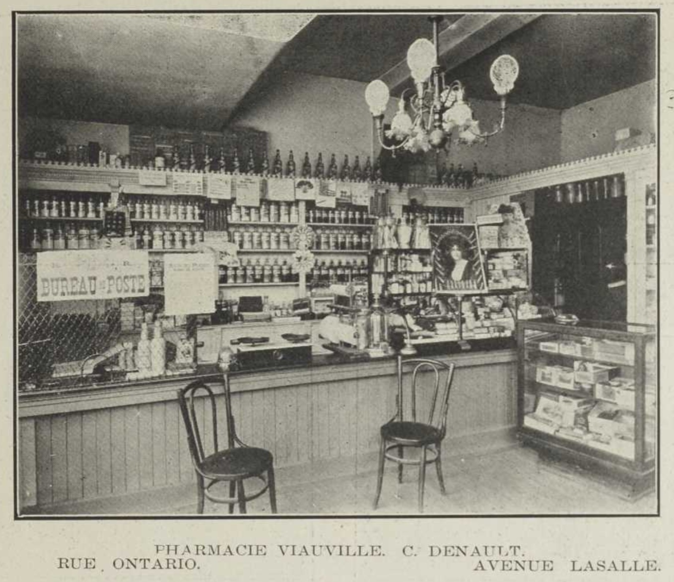 Intérieur de la Pharmacie Viauville de C. Denault, en 1911.