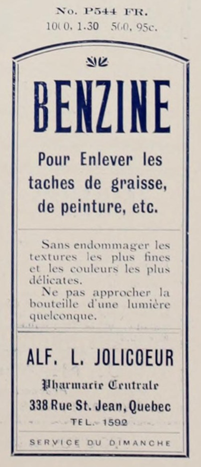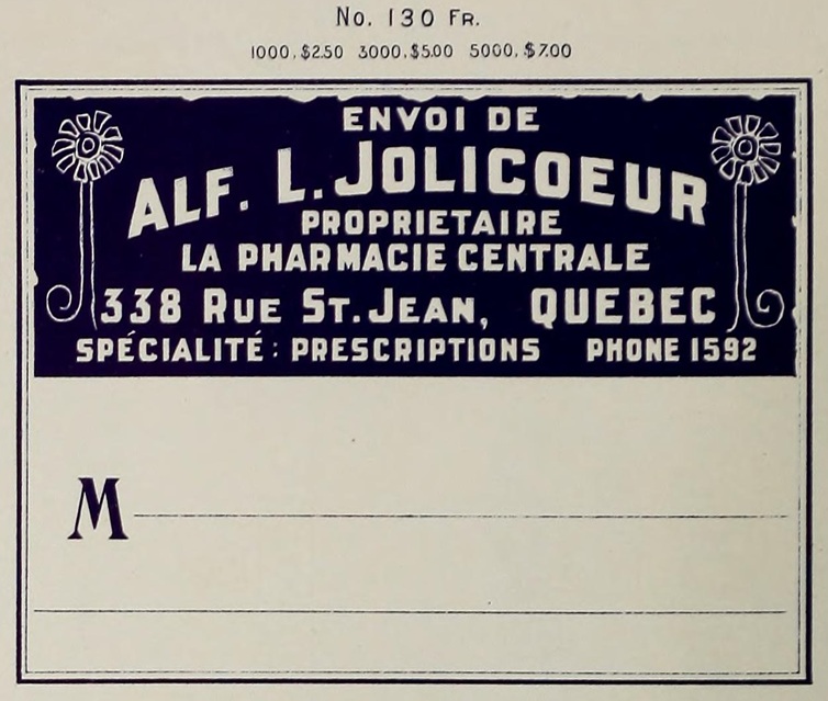 Né à St-Roch de Québec le 10 juillet 1877, Alfred-L. Jolicoeur fit ses études au Petit Séminaire de Québec et à l’Université de Montréal. M. Jolicœur a débuté dans la maison de George et W. Brunet. Affichant des talents remarquables, il a bientôt su égaler ses maîtres. Il fut reçu pharmacien en 1904, et l'année suivante il commença l’exercice de sa profession au 338 St-Jean, assurant la succession de la succursale de la pharmacie Ed. Morin & Cie. Il aurait aussi dirigé un second établissement sur la rue Buade. Il est décédé le 2 novembre 1936.