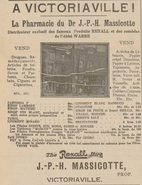 " M. Massicotte fut élève interne à la Women Hospital, Montréal, et à la Fanny Allen Hospital, Burlington, Vt. De 1902 à 1905 il exerça sa profession à Wickham Ouest. C'est depuis 1905 qu'il est établi à Victoriaville. " Il est propriétaire de la Pharmacie de Victoriaville, au 92 rue Notre-Dame, et a sa résidence au no. 72 de la même rue.