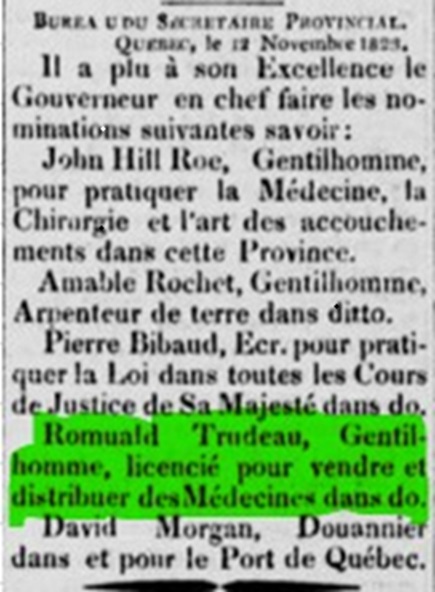 Romuald Trudeau (1802 - 1888) fit ses études classiques au Collège de Montréal, rue St-Paul près du marché Sainte-Anne. Ses classes terminées, en 1819, il choisit la profession d'apothicaire, et en décembre 1823, acheta la pharmacie du Dr. Kimber. En 1833, son magasin était en bordure de la Place Royale (alors place du Vieux Marché). De 1842 à 1872, il occupait le No 157 Saint-Paul. Le pharmacien demeurait à côté, sinon au-dessus, et ne voulut jamais quitter le quartier. Les prospectus de son établissement avaient quelque chose de réjouissant. Ils témoignent que ce marchand de drogue vendait aussi des ornements d'église, des statues, des étoffes, des peignes, des brosses et des curiosités indiennes.